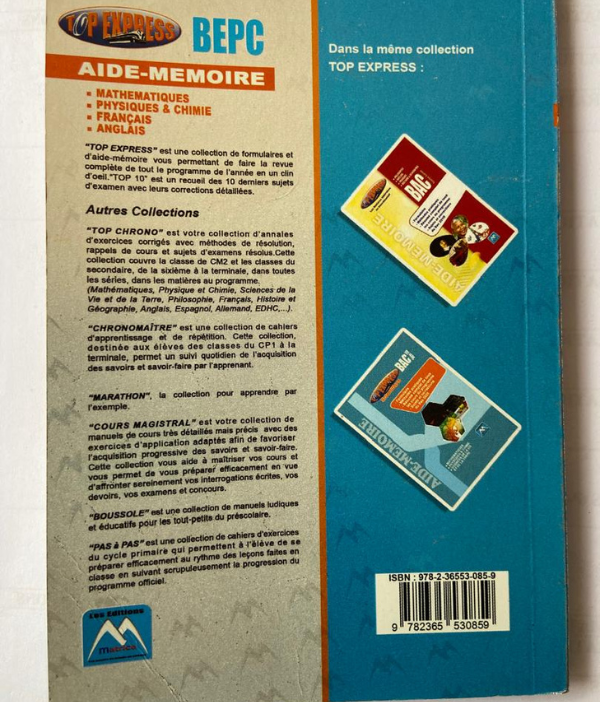 Le document « Top Express Mémo BEPC » regroupe les notions clés à retenir en Mathématiques, Physique-Chimie, Français et Anglais. Il a été conçu pour aider les élèves à mémoriser plus facilement les méthodes, formules, règles et techniques nécessaires à la préparation du Brevet d’Études du Premier Cycle (BEPC).